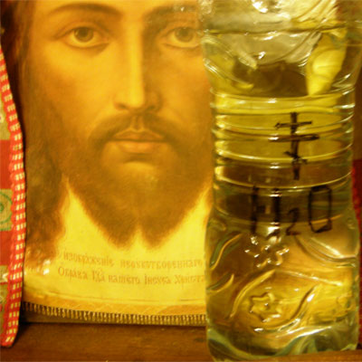 Сейчас в любой церковной лавке можно купить самоклеющуюся наклейку «святая вода» и писать на баках кисточкой не обязательно…. Но однажды, в храме со мной произошел такой случай: после водосвятного молебна в храме подаю отроку, наливающему воду, свою бутылку с надписью «крест и аш два о». Отрок интересуется что за надпись, и я объясняю ему формулу святой воды: «крест – это значит, что на воду воздействовал святой дух, а аш два о – это химическая формула воды». В следующее воскресенье на всех «халявнх» бутылках, в которые наливают святую воду тем, кто забыл свою тару, была написана формула святой воды. Молодежи из воскресной школы эта формула понравилась.