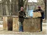 Зима принесла в их жизнь заметные трудности. Самым противным был мороз. Он кусал за нос, щипал, слезил глаза. Не лучше был и холодный ветер. Он пронизывал насквозь, а иногда даже мешал дышать. Под гаражом выросшим щенкам было уже тесно. Но они все-таки забирались туда и грелись по очереди. Выручал их в такие дни теплый люк, расположенный на вершине бугра, за гаражами. Из него валил пар, снег на нем таял, и небольшой островок асфальта вокруг него оставался теплым. Собаки, прижавшись друг к другу, ютились на этом пятачке, тоскливо поглядывая на мусорные баки. Возле них все чаще стали появляться чужаки. С чужими собаками было справиться не трудно, а вот с людьми… Людей, копошившихся в «их» мусоре, становилось всё больше. Они приходили парами, сменяя друг друга, да так часто, что собакам порой и подойти к бакам было некогда. А уж после людей найти в мусоре что-нибудь вкусненькое было вообще невозможно. Поначалу Злюка даже пытался их отогнать от баков. Но, получив сильный пинок в бок, убежал, скуля, на бугор и лишь оттуда зло облаял непрошенных гостей.
